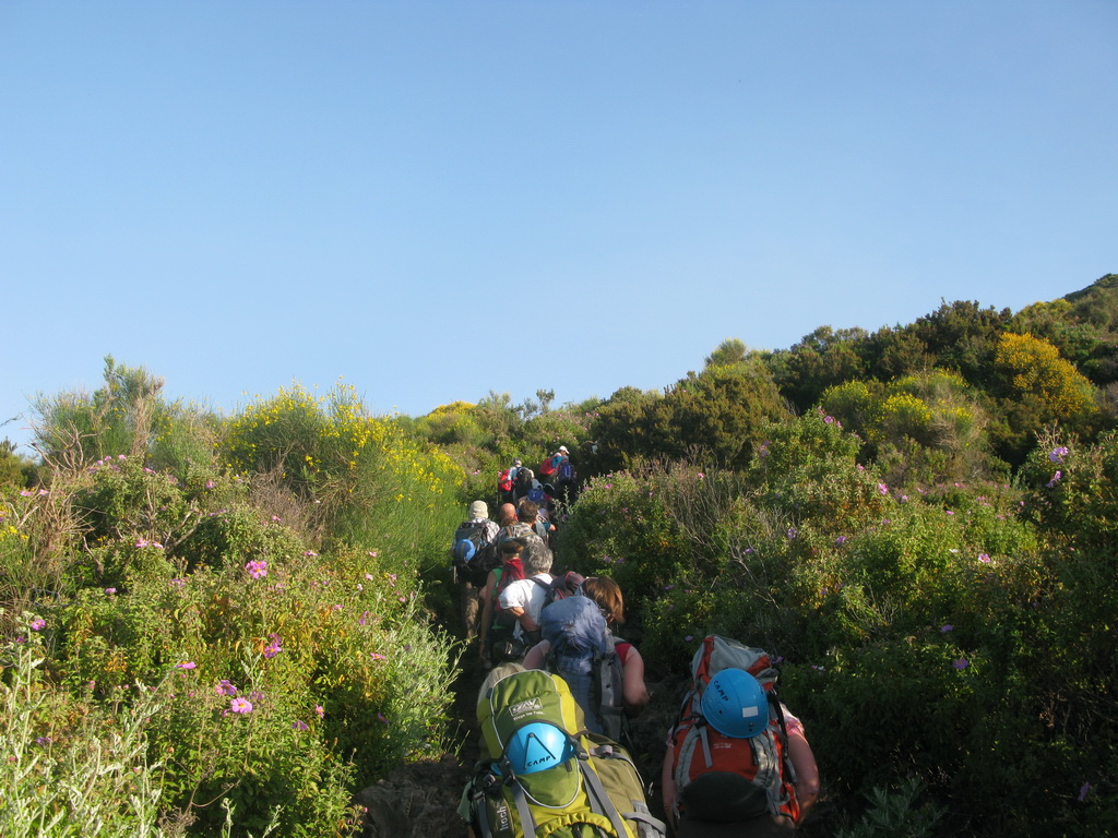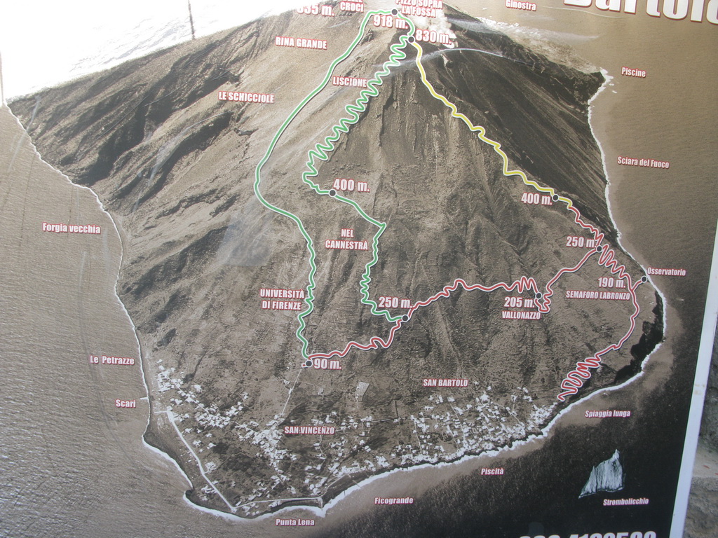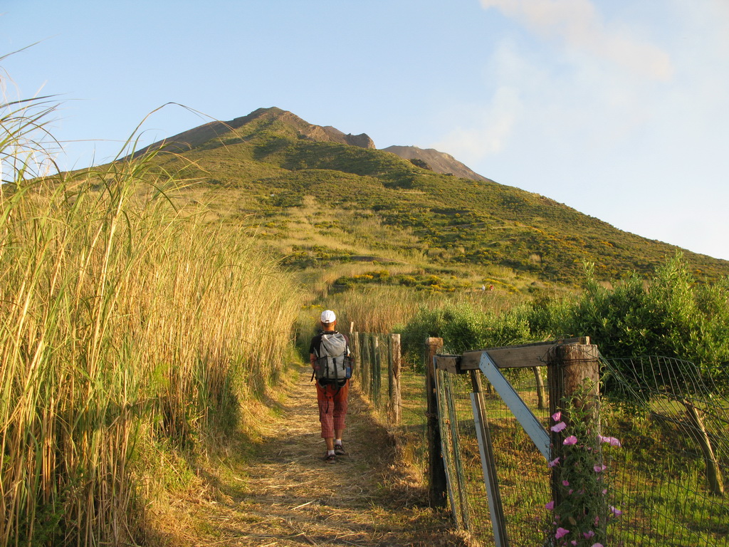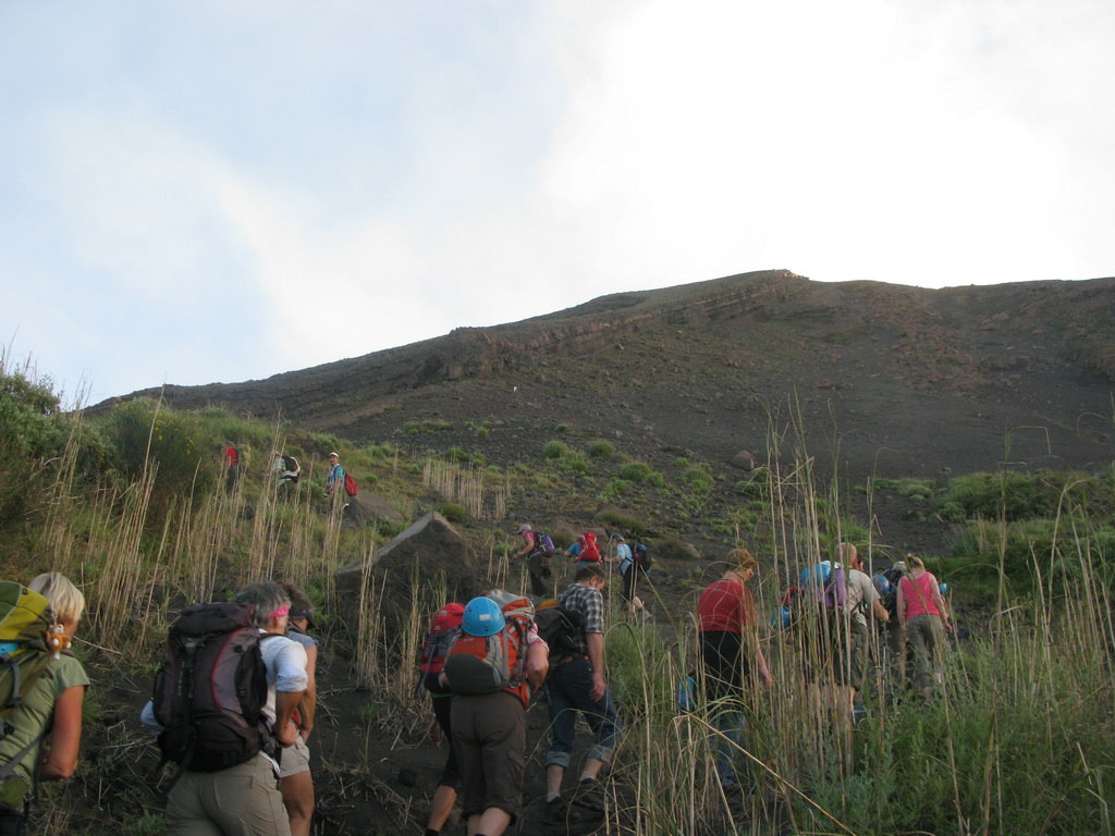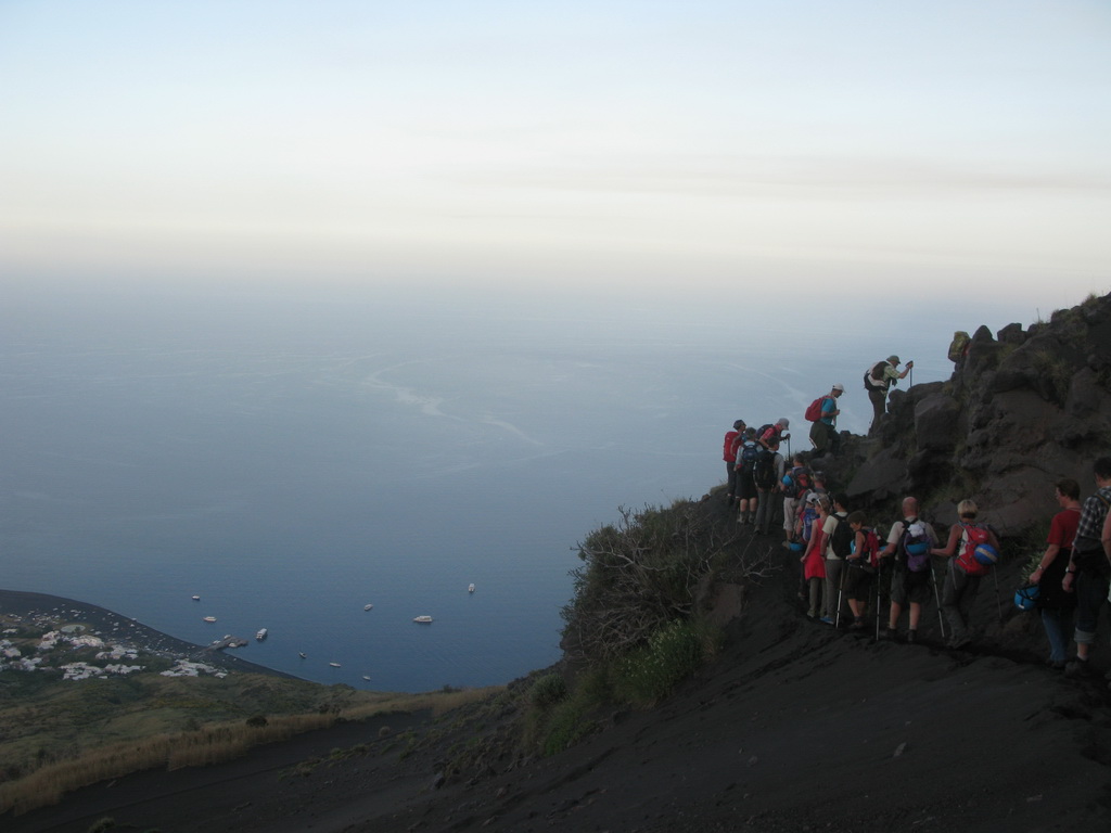 Na druhý deň po našom príchode na ostrov sme v podvečer stúpali hore strmými serpentínami v zástupe ľudí. Naša skupinka mala 12 ľudí. Jeden talian sa musel po chvíli otočiť, keďže nevládal z dychom. Výstup vedie pomerne dobrým chodníkom a 900 výškových metrov sa pohodovým tempom zdoláva za tri-štyri hoďky.
