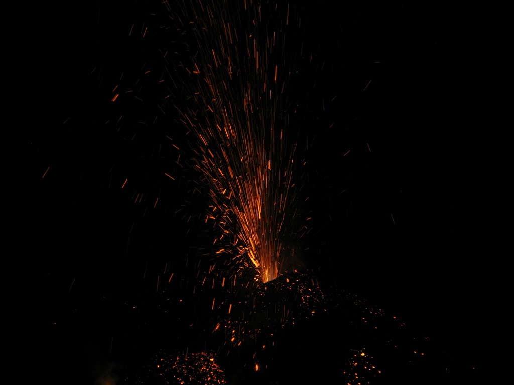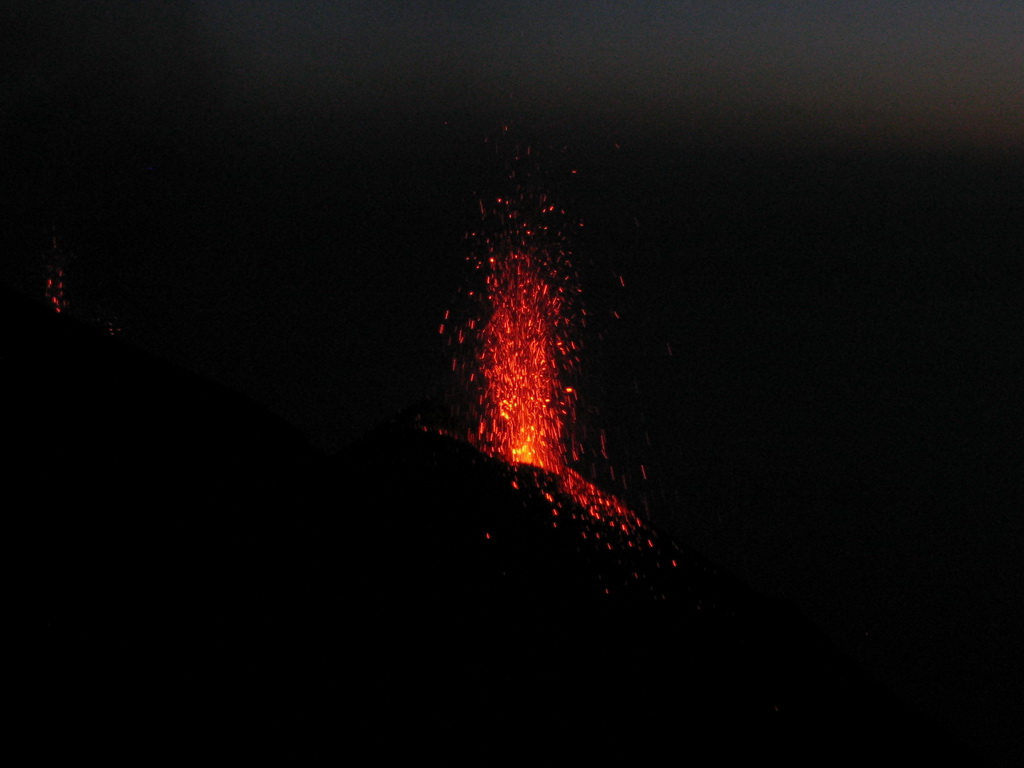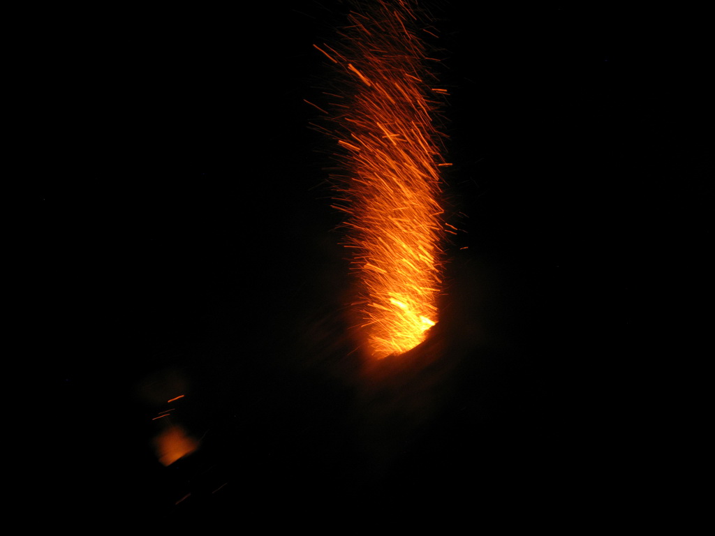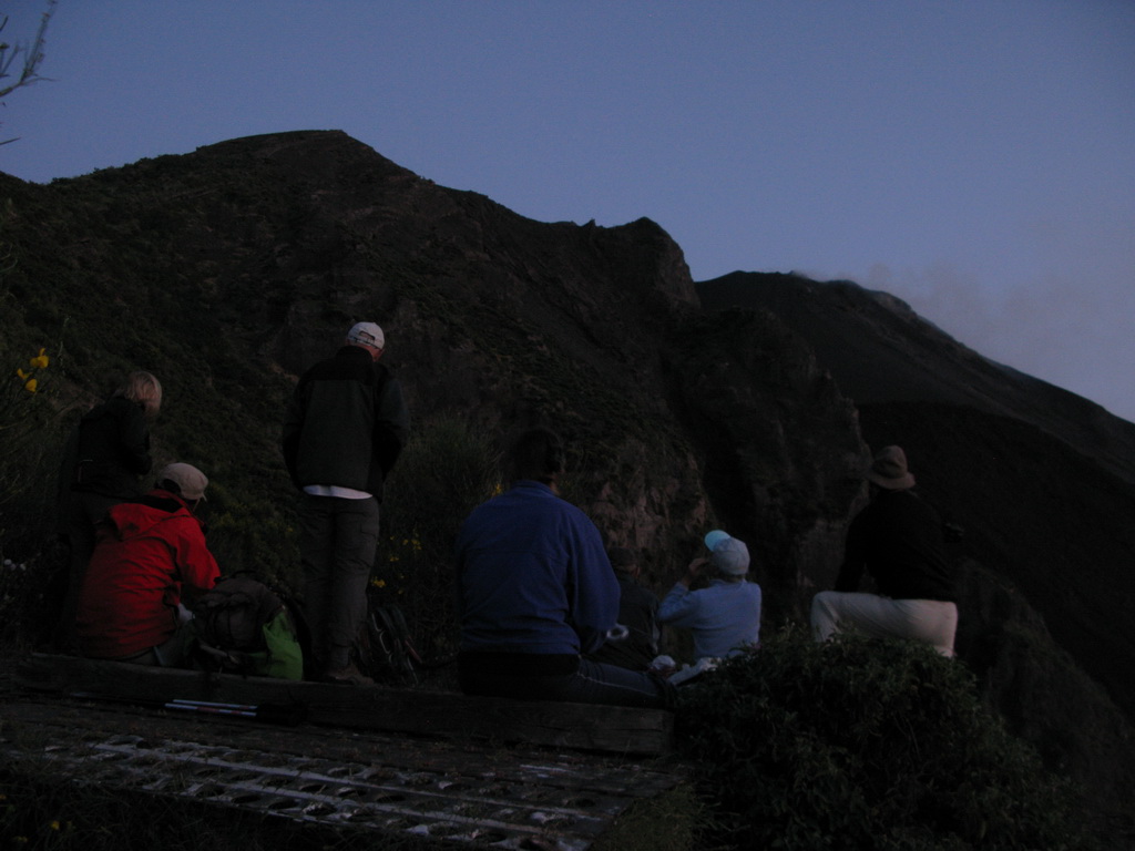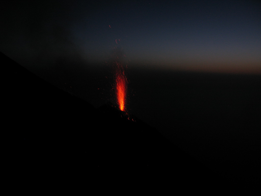 Prichádzame na hrebeň vyrážajúci k vrcholu sopky od miesta zvanom Semaforo Lauronzo. Tu sme to uvideli prvý raz... Stmievalo sa ale nasledujúcich 200 výškových metrov sme priam vybehli. Vo výške 400 metrov nad morom je tu taká malá vyhliadková plošina. Oficiálne sa ďalej bez sprievodcu nesmie pod hrozbou veľkej pokuty.(Tabuľa) To sme dnes ani nemali v pláne. Sadli sme si na plošinu a pozerali sa na úžasné divadlo: vybuchujúci kráter za ohľušujúceho rachotu chŕlil do výšky ohňostroj, divadlo sa opakovalo približne každých 20 minút.