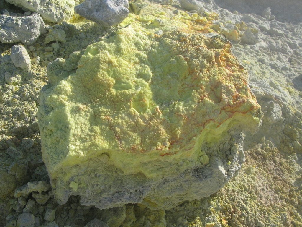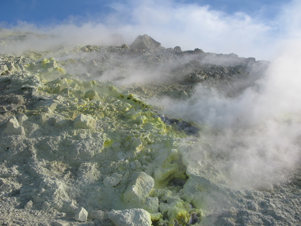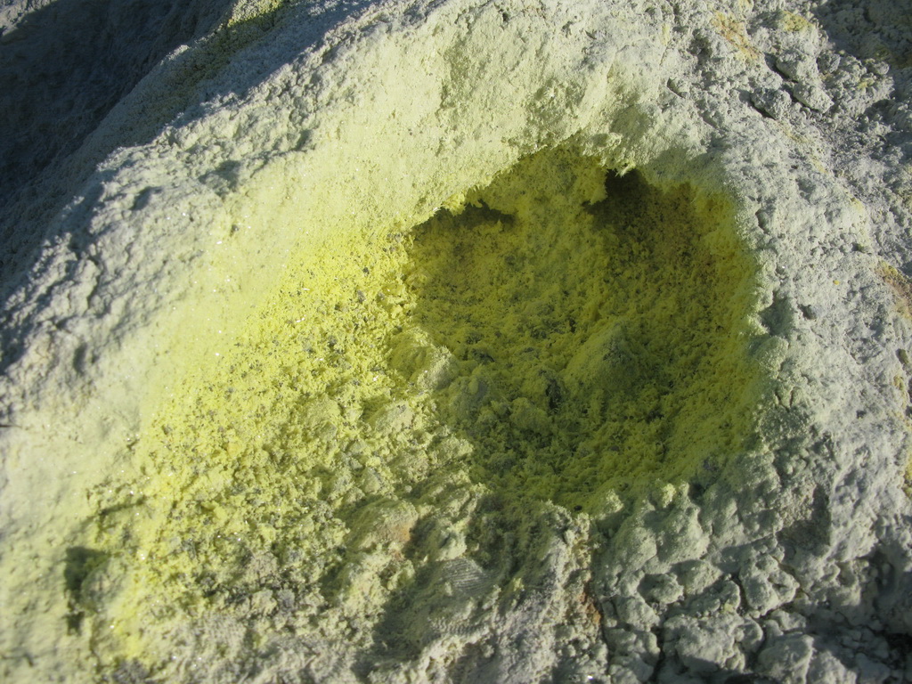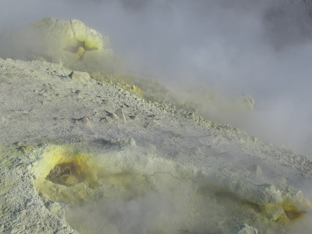 Na okraji krátera je možné pozorovať veľké fumaroly syčiace z puklín. Je tu množstvo vyzrážanej síry vo všetkých odtieňoch žltej a bielej farby. Pripravte sa na tomu zodpovedajúci smrad. Tabuľa na začiatku chodníčka dokonca varuje pred výparmi, ktoré môžu byť jedovaté...