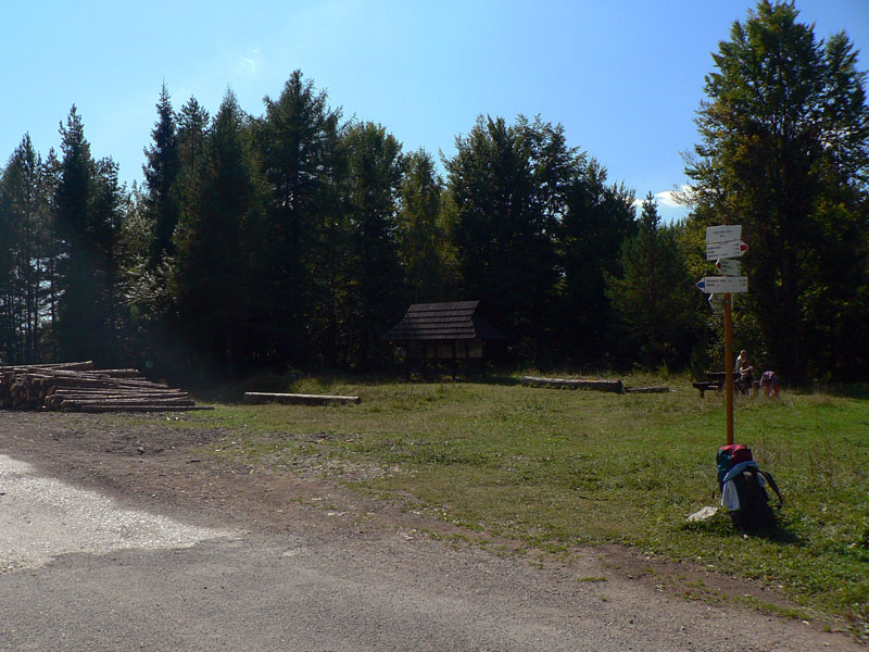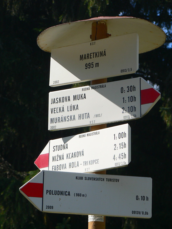 Tak dúfam že sa z lúky nestane „golf resort“ a kráčam (stále po asfalte) na jej druhý koniec. Tu na Pieskoch je táborisko aj náučné tabule, dobré miesto na obed. Na hrad je to chvíľa, ale tam to poznám a musel by som sa zase sem vracať, tak radšej pokračujem ďalej po červenej. Kedy už ten asfalt skončí? A kde sú tie hlboké lesy? Medzi Jaskovou mukou a Maretkinou striehnem na odbočku – má tu byť podľa mapy vyhliadka. Nenápadná šípka na strome naviguje doľava na lesnú cestu, idem. No značenie ako u nás: neporiadne. O chvíľu som späť, samozrejme že tam nič nebolo. Až na Maretkinej, o riadny kus ďalej oproti mape, seriózny smerovník aj značka. Vyhliadka z Poludnice stojí za to: Piecky a Muráň pod nohami, Revúca v diaľke.