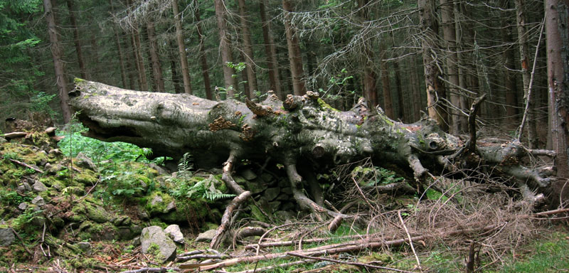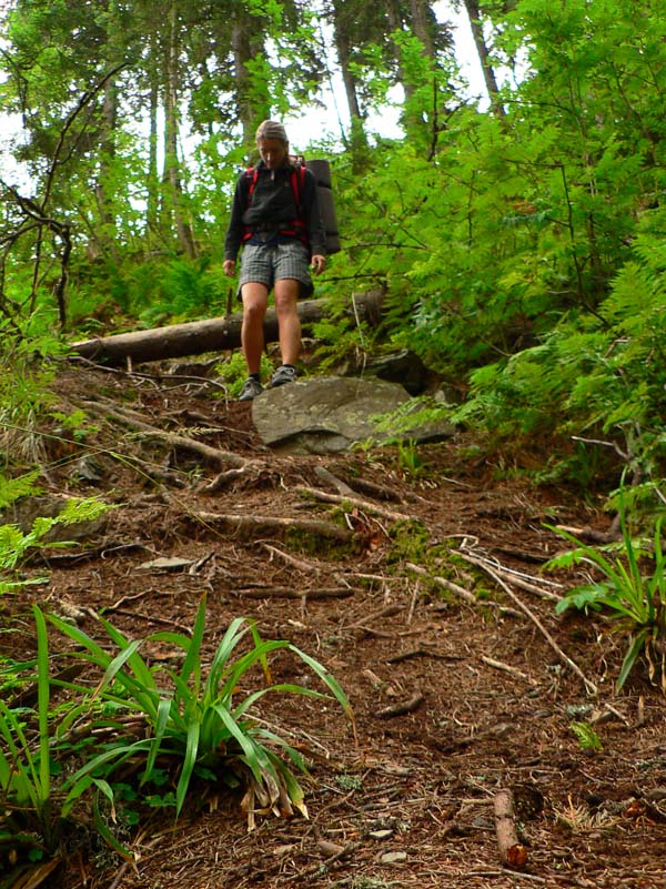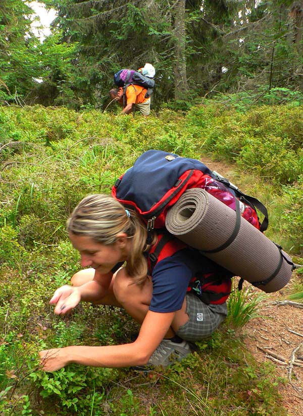 Či to bolo únavou, či dažďom, cestou dole sme odbočili z chodníka. Keď sme sa do sýtosti napásli na malinách, velíme cestu späť po vlastných stopách. Výlet sme si predĺžili o 2,5 hodiny, ale aspoň počasie hrá s nami, prestalo pršať. Cestou späť nachádzame na kmeni stromu vyrytú šípku. Zjavne nie sme prví, ktorí zblúdili, veď náš chodník vyzerá miestami lepšie ako ten so značkou! Šípka vyzerá dôveryhodne, ideme teda smerom, kam ukazuje – cez husté malinčie. Postupným oberaním a predieraním sa dostávame k červenej značke. Už len 15 minút a sme v suchu! Zostupujeme spod vrcholovej plošiny Vepra húštinou malín, stromkov a iného podrastu, sme mokrí viac ako keď pršalo – akoby sme prechádzali pomedzi kefy zapnutej autoumyvárky.