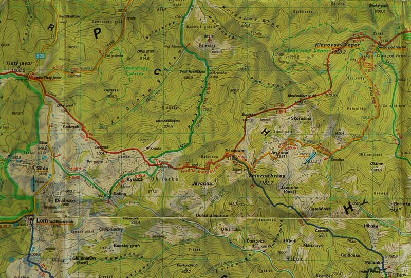 Ideme červenou Rudnou magistrálou. Kúsok po pasienkoch, okolo kravína na Uhliarke, ale potom už väčšinou lesom. Huby rastú ako po daždi, dubáky a plávky nám z ihličia mávajú. Mierne stúpajúcou zvážnicou v lese (zas tie maliny!) sa dostávame do sedla Tri chotáre, pokračujeme cez Šopisko striedavo lúkami a lesom. Chodník vedie po širokom hrebeni a popri ňom často vidieť hromady kameňov. Povyvážali ich sem asi gazdovia, ktorí dakedy dávno premieňali les na polia a pasienky. Dnes sa sem les znovu vracia.