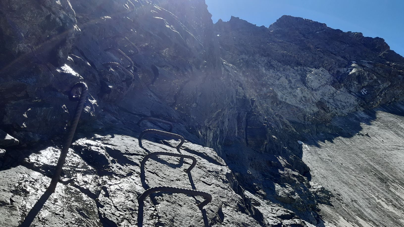 Zabezpečená trasa nie je klasickou ferratou, nie je na nej oceľové lano ako na štandartných ferratách. Jej začiatok je dobre označený na okraji ľadovca pri okrajovej trhline. Keďže väčšina ľudí smerujúcich na Bianograt prechádzajú tadiaľto ešte za tmy, tak sú tu aj odrazky. Po prvých metroch na skale nasleduje pomerne dlhý traverz, až kým neuvidíte železné kramle v skalnej stene.