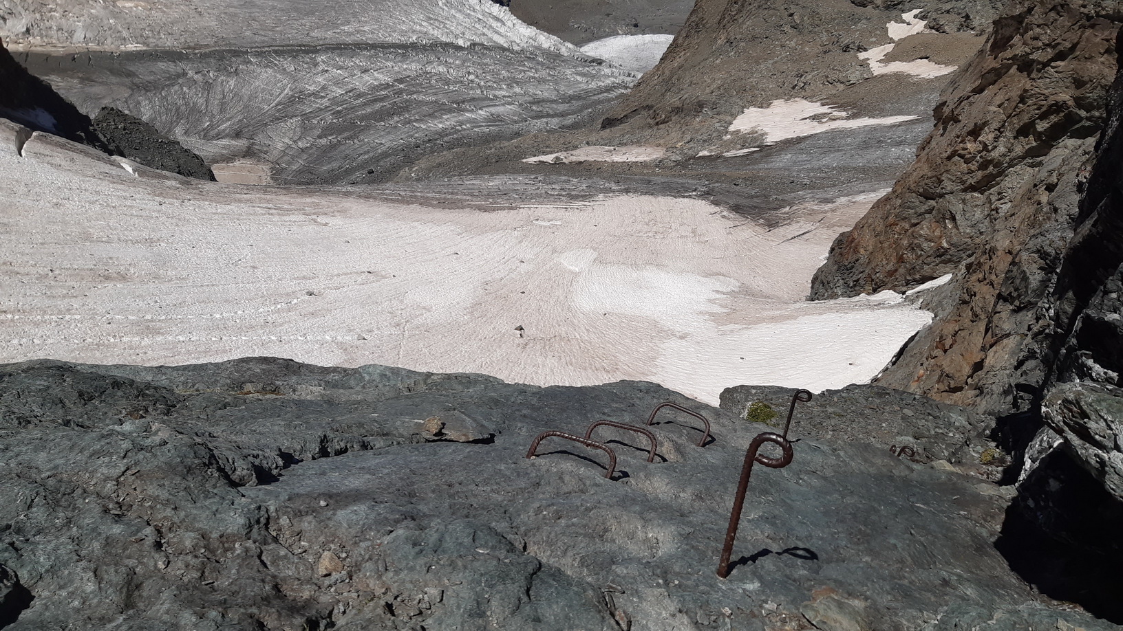 Trasa na Berninu cez Biancograt je aj v prvej polovici leta stále v relatívne dobrej podmienke a pomerne hojne navštevovaná. Po traverze pod Fuorcla Prievlusa je asi najdôležitejšou informáciou, že výstup do sedla už neprebieha ľadovcovo firnovým žlabom v pravej časti, ale chodí sa vľavo po kramlami a tyčami zabezpečenej trase (foto).