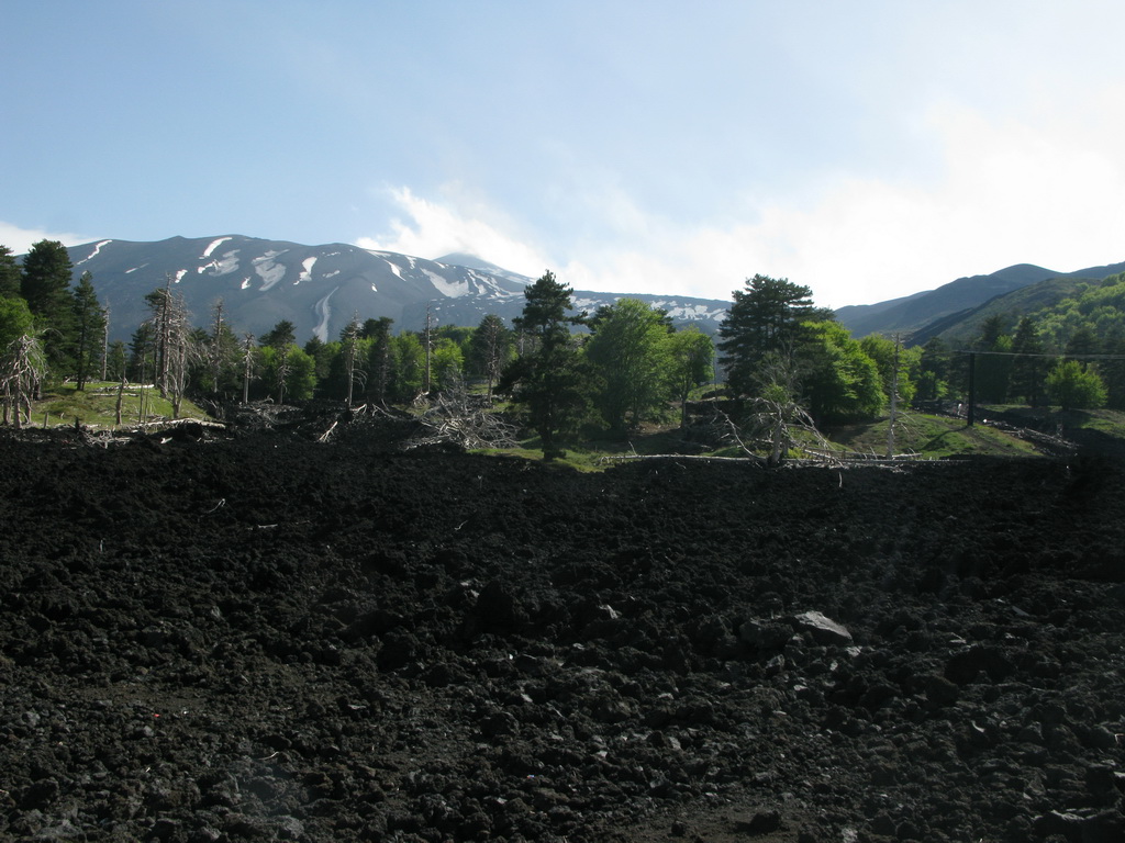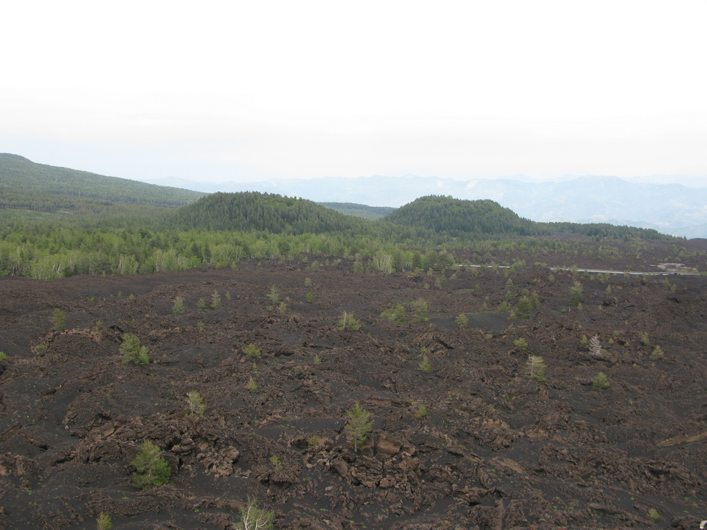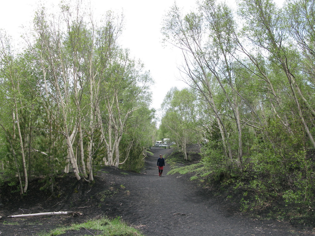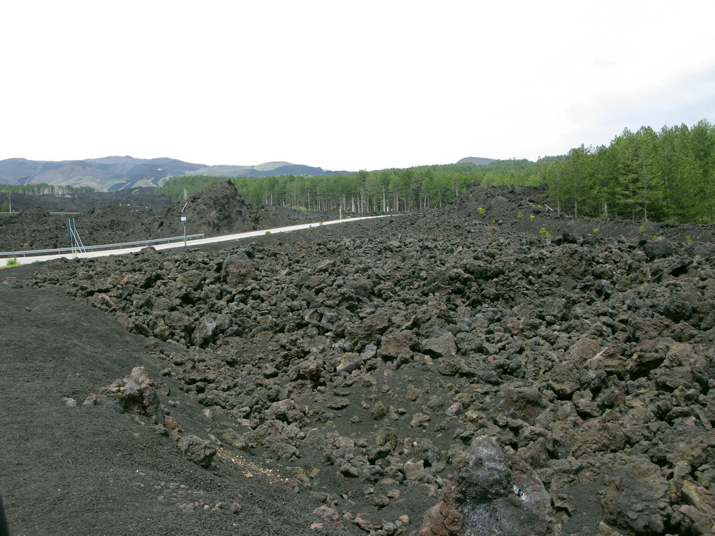 Serpentíny hustým borovicovým lesom nás vedú hore. Také obrovské borovice sme ešte nevideli. Prechádzame okolo chaty Bruneck a čoskoro sa vynárame z lesa. Ten tu totiž pretína široký pás stuhnutej lávy z roku 2002. Ako keby tu prefrčala lavína... Cez lávu vedie nová asfaltka.