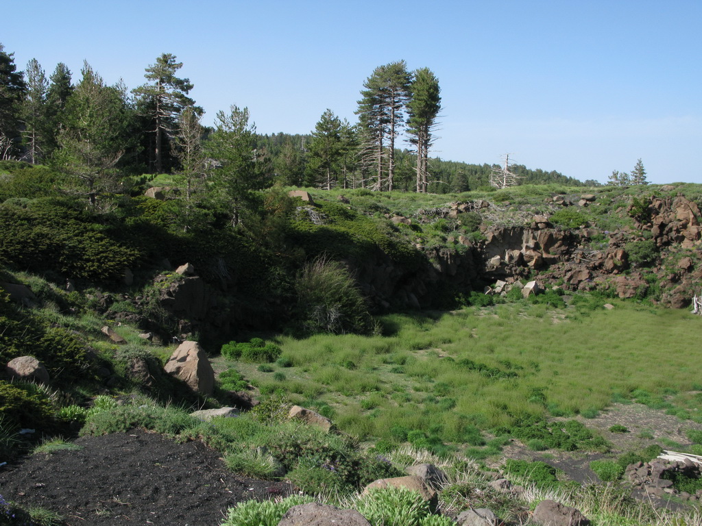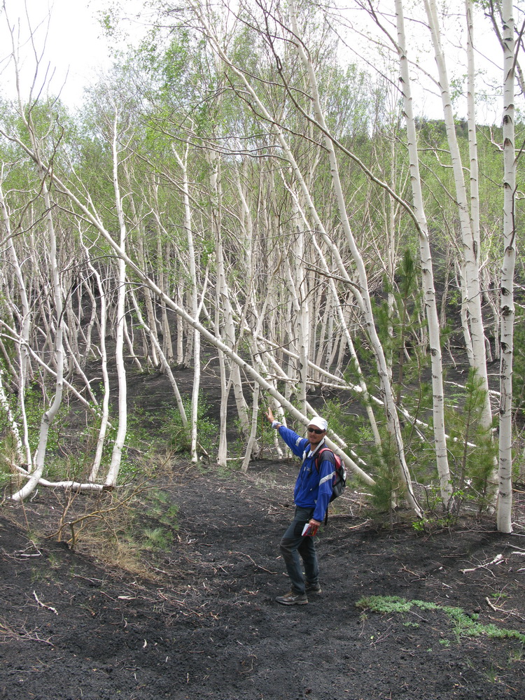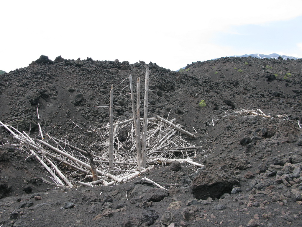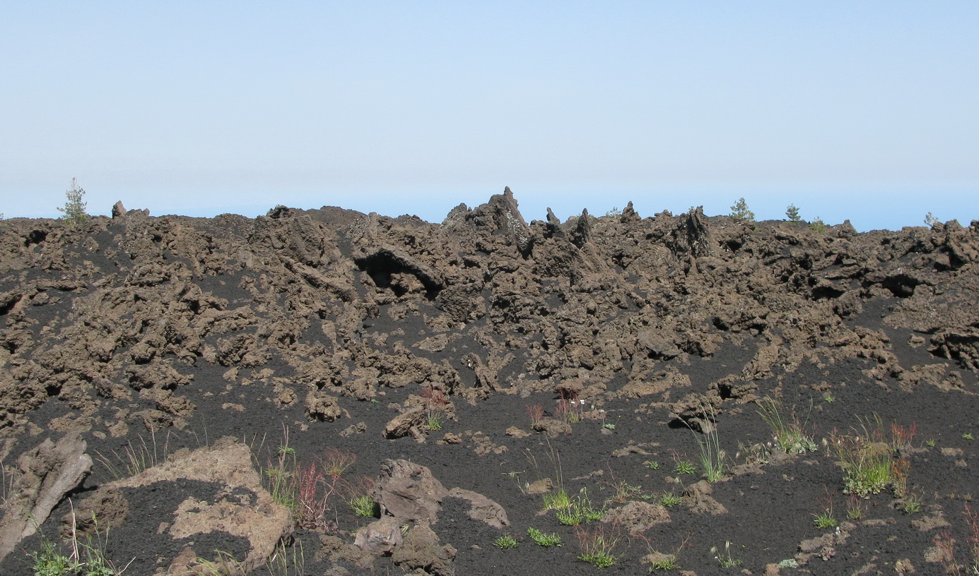 Serpentíny hustým borovicovým lesom nás vedú hore. Také obrovské borovice sme ešte nevideli. Prechádzame okolo chaty Bruneck a čoskoro sa vynárame z lesa. Ten tu totiž pretína široký pás stuhnutej lávy z roku 2002. Ako keby tu prefrčala lavína... Cez lávu vedie nová asfaltka.