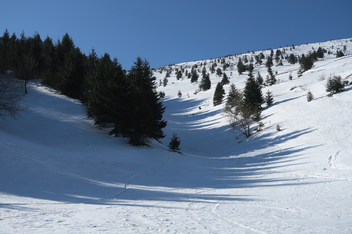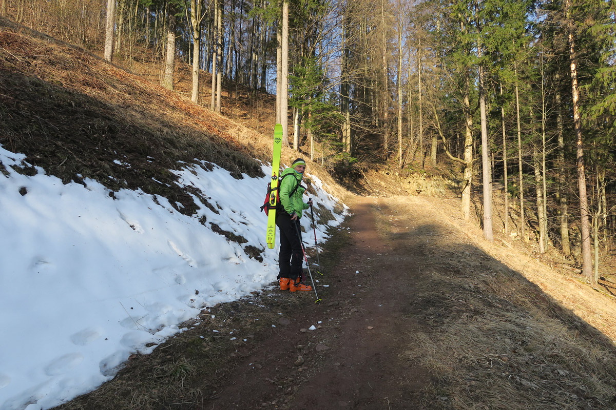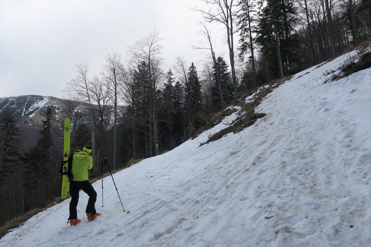 Dole lepíme mokré pásy a ťaháme sa späť na Chleb žľabom smerujúcim k hornej stanici kotvy.Je jasné,že aj tu to stihlo trochu odmäknúť tak pokračujeme k vrcholu.Zaťahuje sa.Tesne pod vrcholom prepíname do zjazdového módu lebo vrch je tráva.Chrbtom Chleba so zatočením na brucho povedľa výstupového žľabu užívame jar vo Fatre.Nižšie v nafúkaných miestach sem tam vata,ktorá nám pripomína byť v strehu.Ďalej lyžujeme až na miesto kde sme ráno zapínali..
