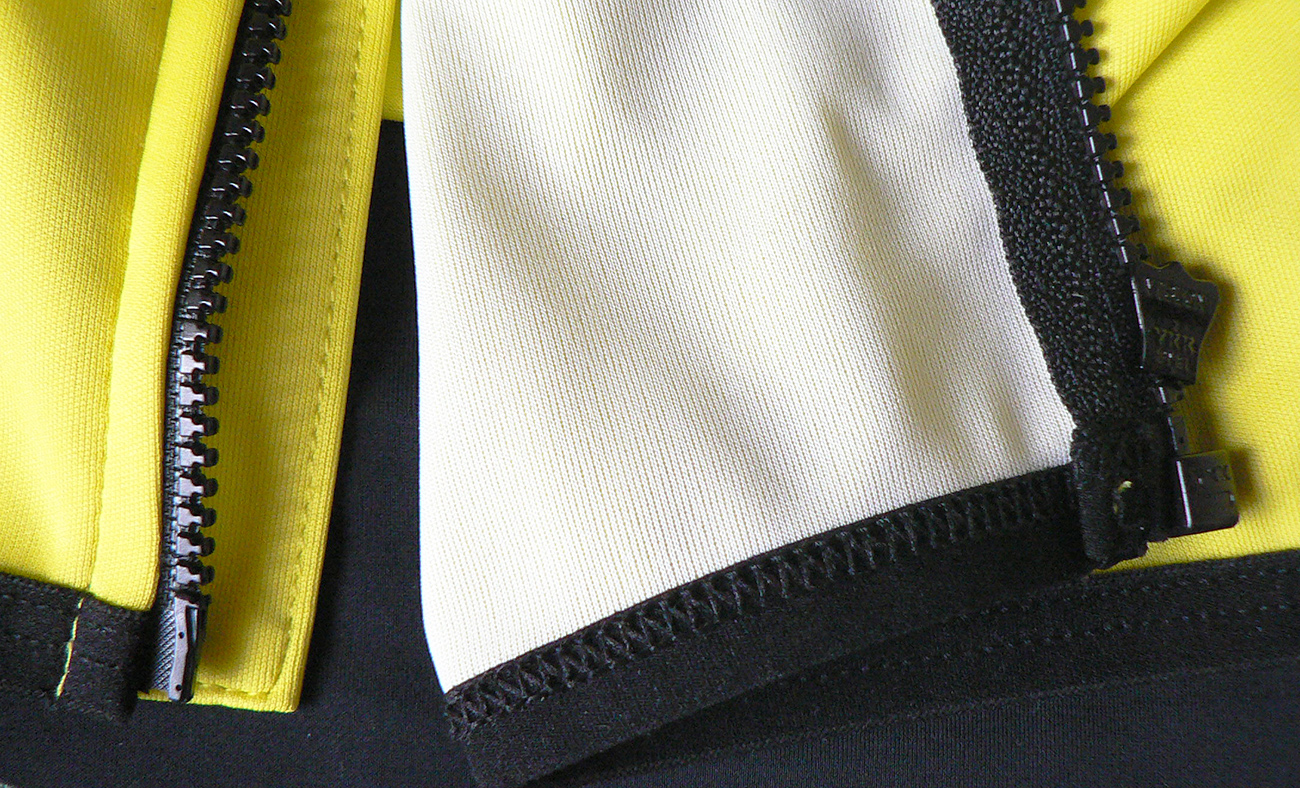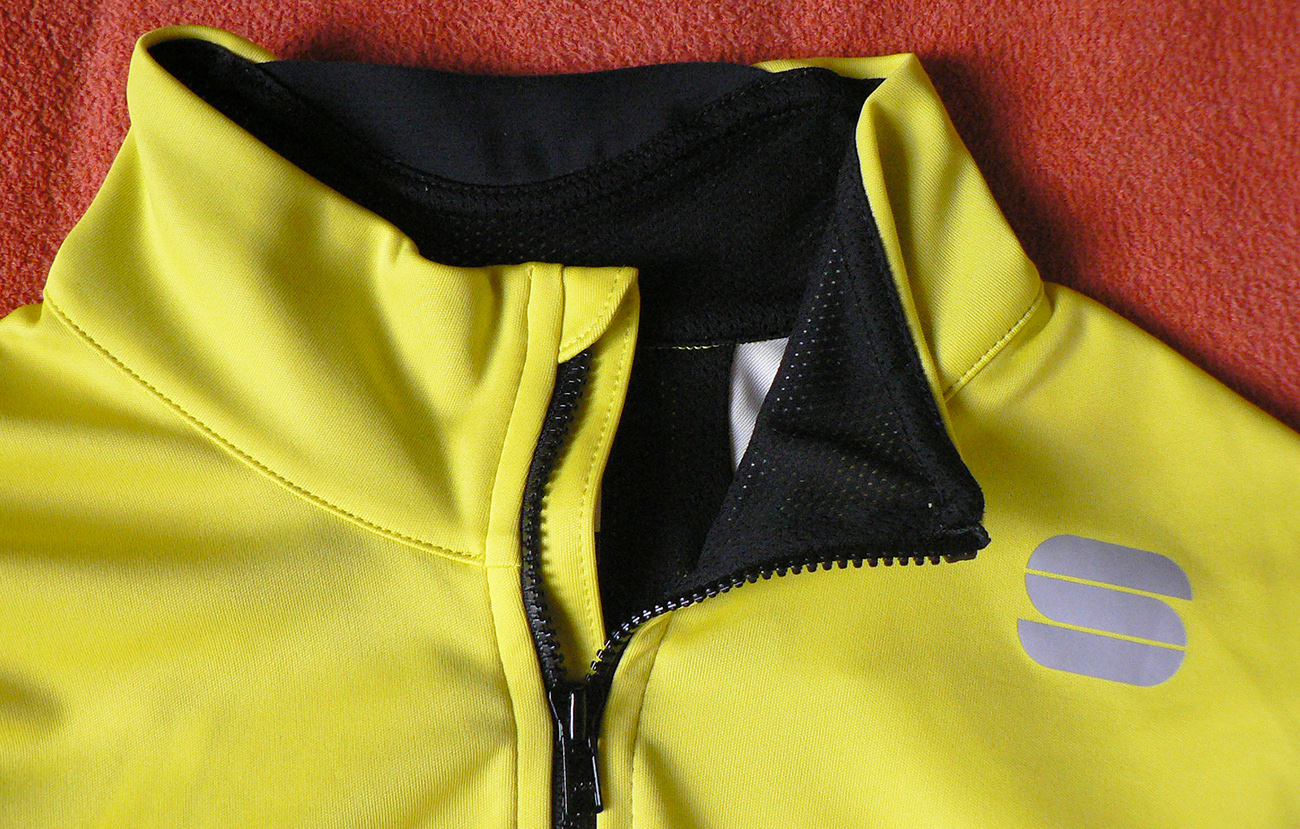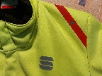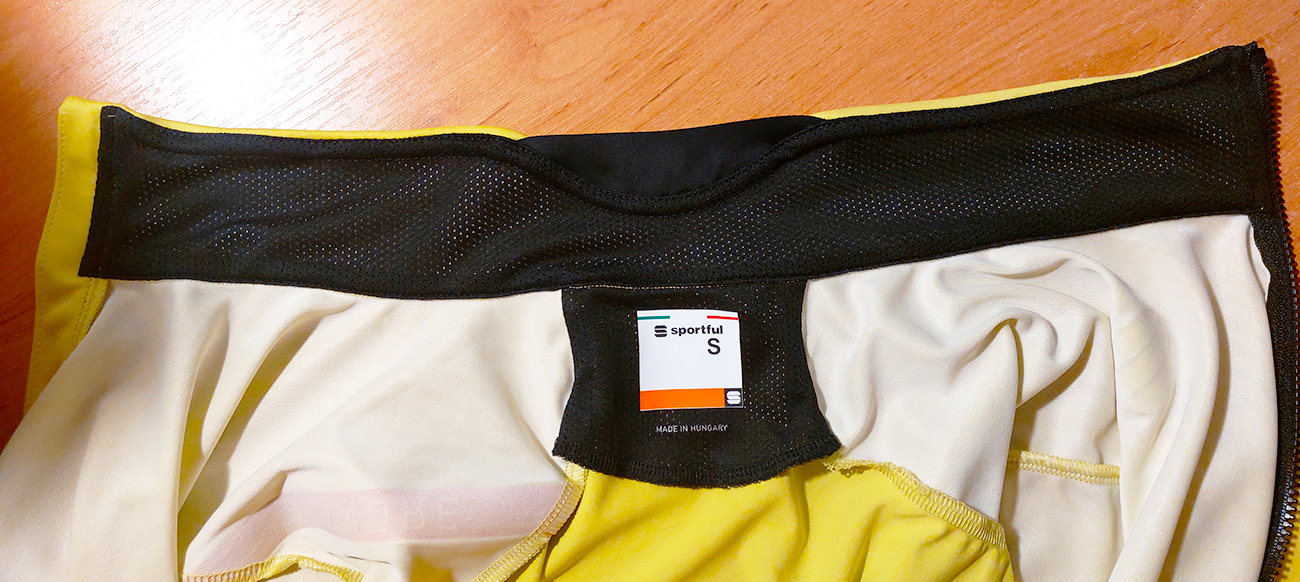 Základom je materiál NoRain na chrbtovom paneli, značkou Sportful patentovaná tkanina s vysokou odolnosťou, ale najmä výborne priedušná a zároveň nenasiakavá, čo má zabezpečiť vodoodpudivá úprava na báze nanotechnológie. Na ramenách a vpredu je použitá iná tkanina WindShield 3L, odolnejšia zase proti vetru. Nechýba vyšší golier, zvnútra ešte podšitý sieťkou, predĺžené rukávy, siahajúce až k lakťom a ukončené len rezom. Pod klasickými troma vreckami je chrbtová časť dole tiež mierne predĺžená a strihnutá do oblúka kvôli lepšej ochrane pred vodou, odfrkujúcou od zadného kolesa. V praxi sa ale ten pruh látky naskladá pod vrecká, nejaké predĺženie dresu neregistrujem.