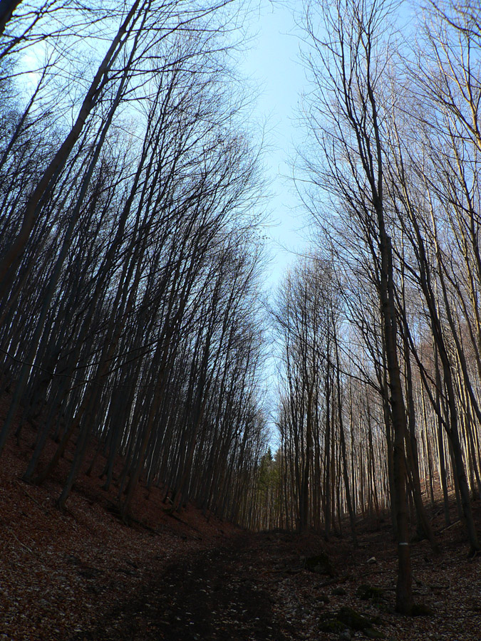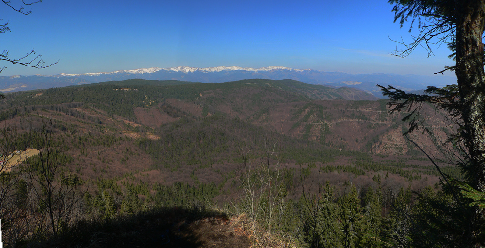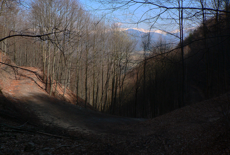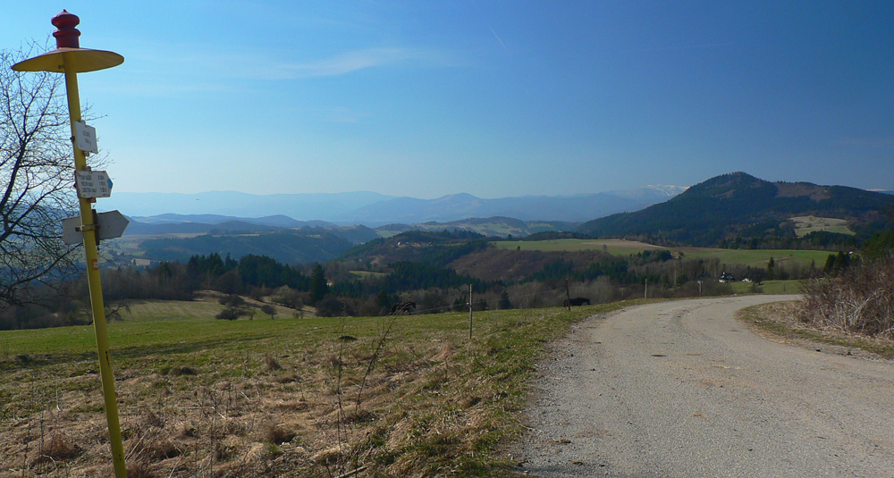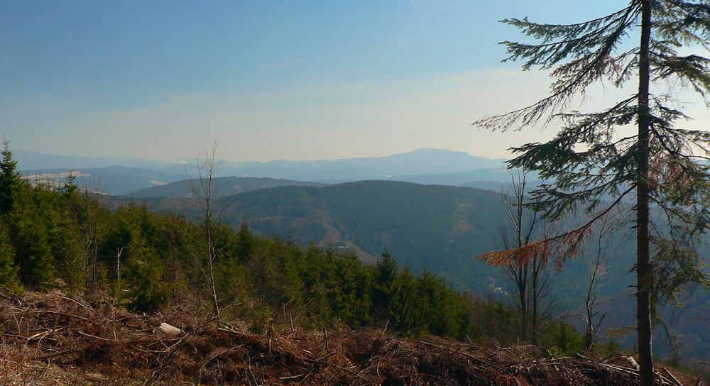 Nazad hore na značke, na hrebienku, príjemná lesná cesta s výhľadmi niekam do hĺbky Veporských vrchov, k Osrbliu a Balogu. Vľavo vzadu v opare Klenovský Vepor, vpravo výhľady na biely hrebeň NT, všetko vďaka rúbaniskám.