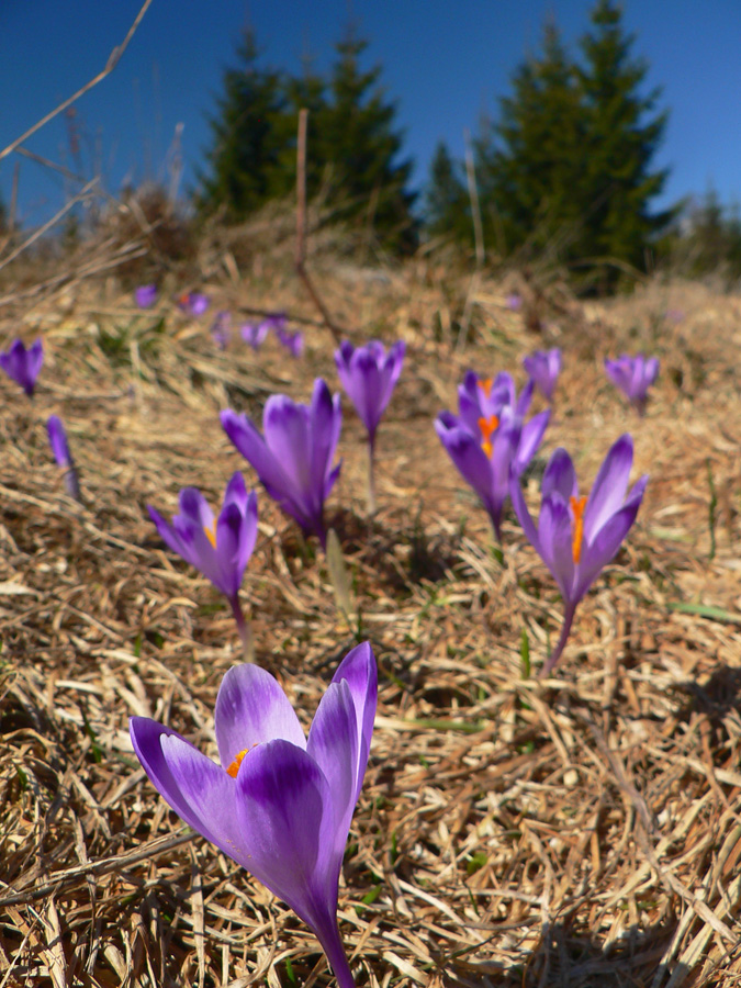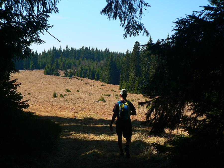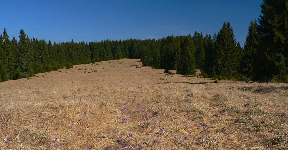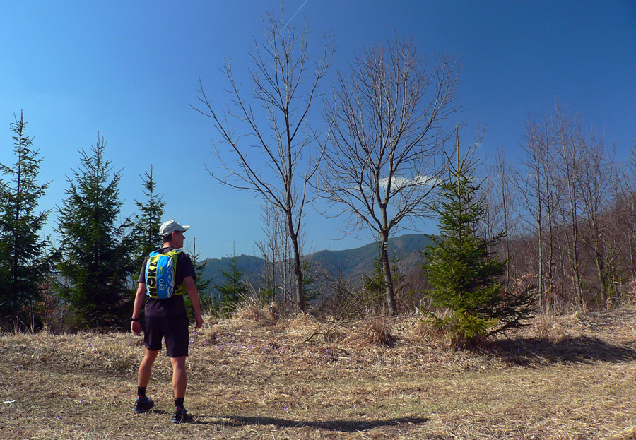 Mierime pod Ľubietovský Vepor. Miestami sa vpredu ukáže jeho Hrb. Zvážnica o chvíľu preskočí na druhú stranu hrebeňa a zmení sa na zaprasený chodník, behať sa tu nedá. Až posledný úsek nás vypľúva na šafránom sfialovené lúky, jedna má pekný názov Žliabky.