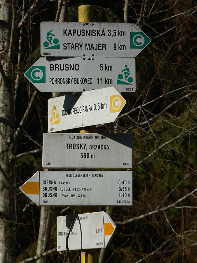 Asfaltový úsek k Starému majeru zas prekluskáme, pasúce sa kone čudne hľadia, slovka nepovedia... Odbočka doprava na žltú a ponor z lúk do lesa. Čaká nás Peklo, ďalšia írečitá dolinka, z ktorej sa vynoríme v Brusne. Ani táto dolinka nie je scenéricky nič moc, aj sa tu ťaží, ale ciest je tu na mraky, aj cyklotrás všade, na bajkturizmus je toto ideálny kraj.